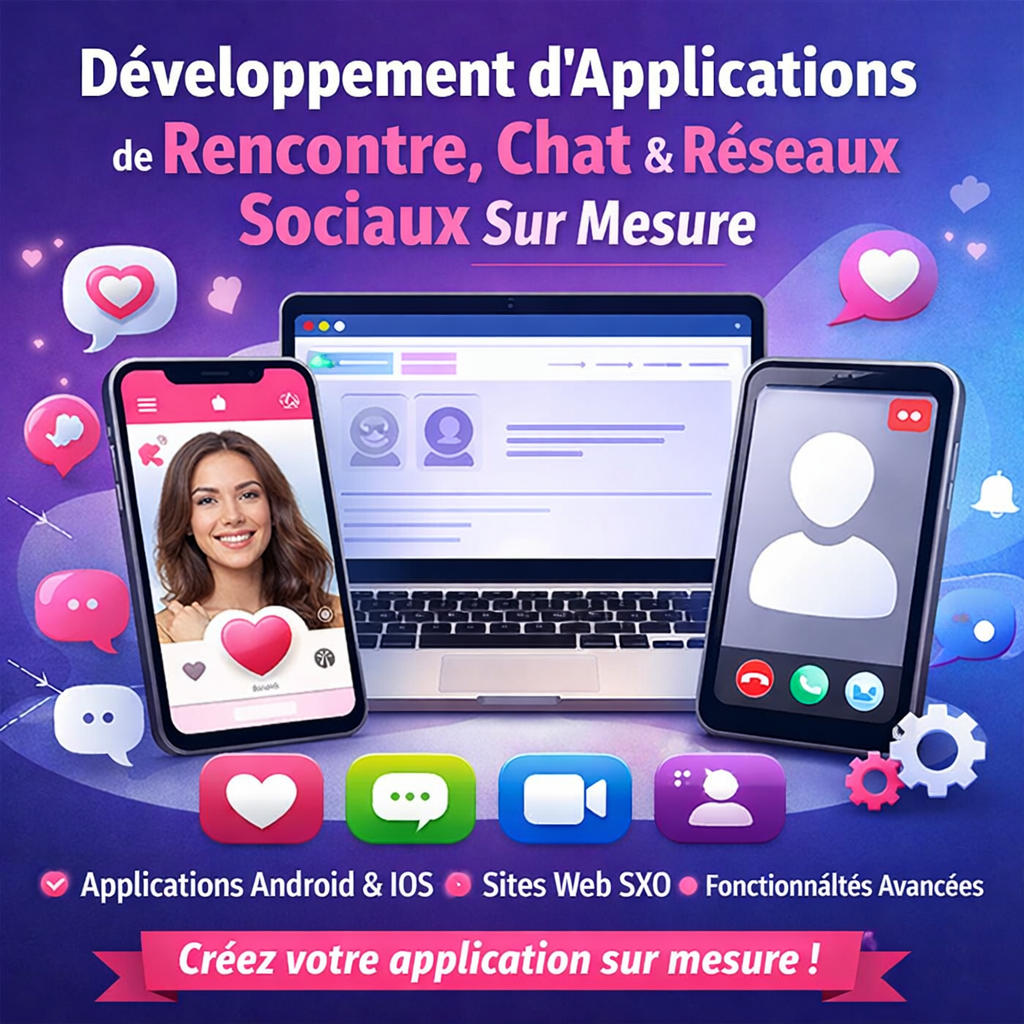 Nous sommes une équipe spécialisée dans le développement d’applications mobiles et de sites web, avec une expertise approfondie dans les plateformes de rencontre, de messagerie et les réseaux sociaux.