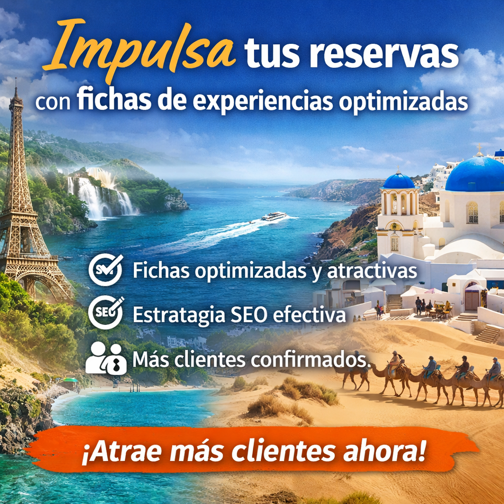 Mejora la visibilidad de tus tours y aumenta tus reservas con fichas optimizadas, SEO estratégico y contenido orientado a la conversión. Empieza a atraer más clientes hoy.
